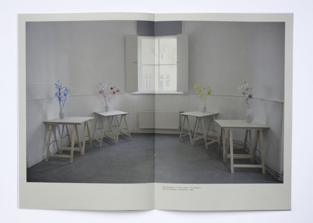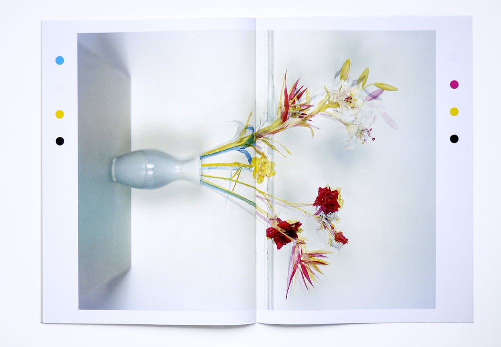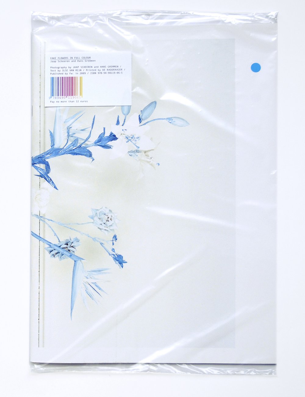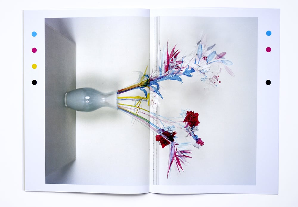 Is it possible to create a three dimensional colour seperation? That was the question that triggerd Jaap Scheeren and Hans Gremmen to start this experiment. A bouquet of fake flowers was arranged as starting and striving point. The next step was to create four still lifes of this bouquet: one in Cyan, one in Magenta, one in Yellow and one in Black. These still lifes were photographed and merged into one image. In theory this should have been the same as the startingpint, but in practice it became ‘Fake Flowers In Full Colour’. Ilse van Rijn wrote the text ‘Phoenix’ for this publication.